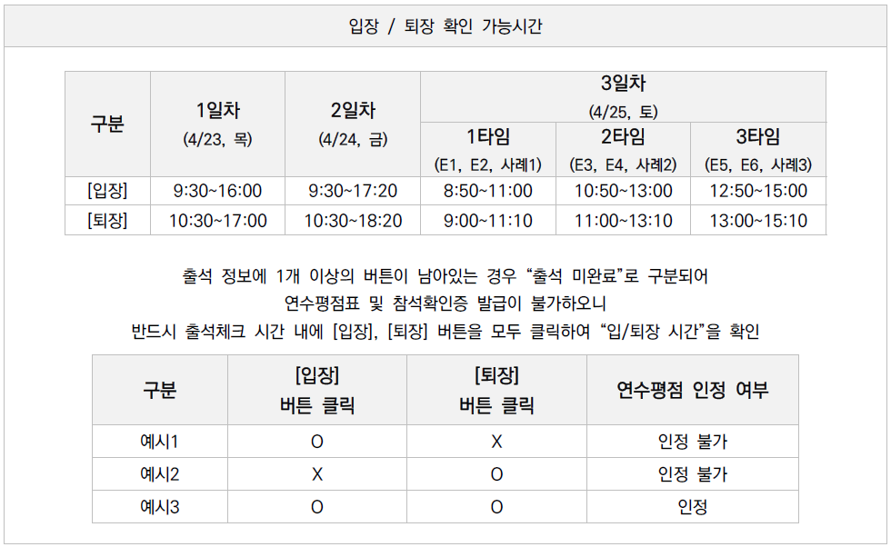 ※ 학술대회 기간 중 출석체크 입/퇴장 확인시간 참고 부탁드립니다.