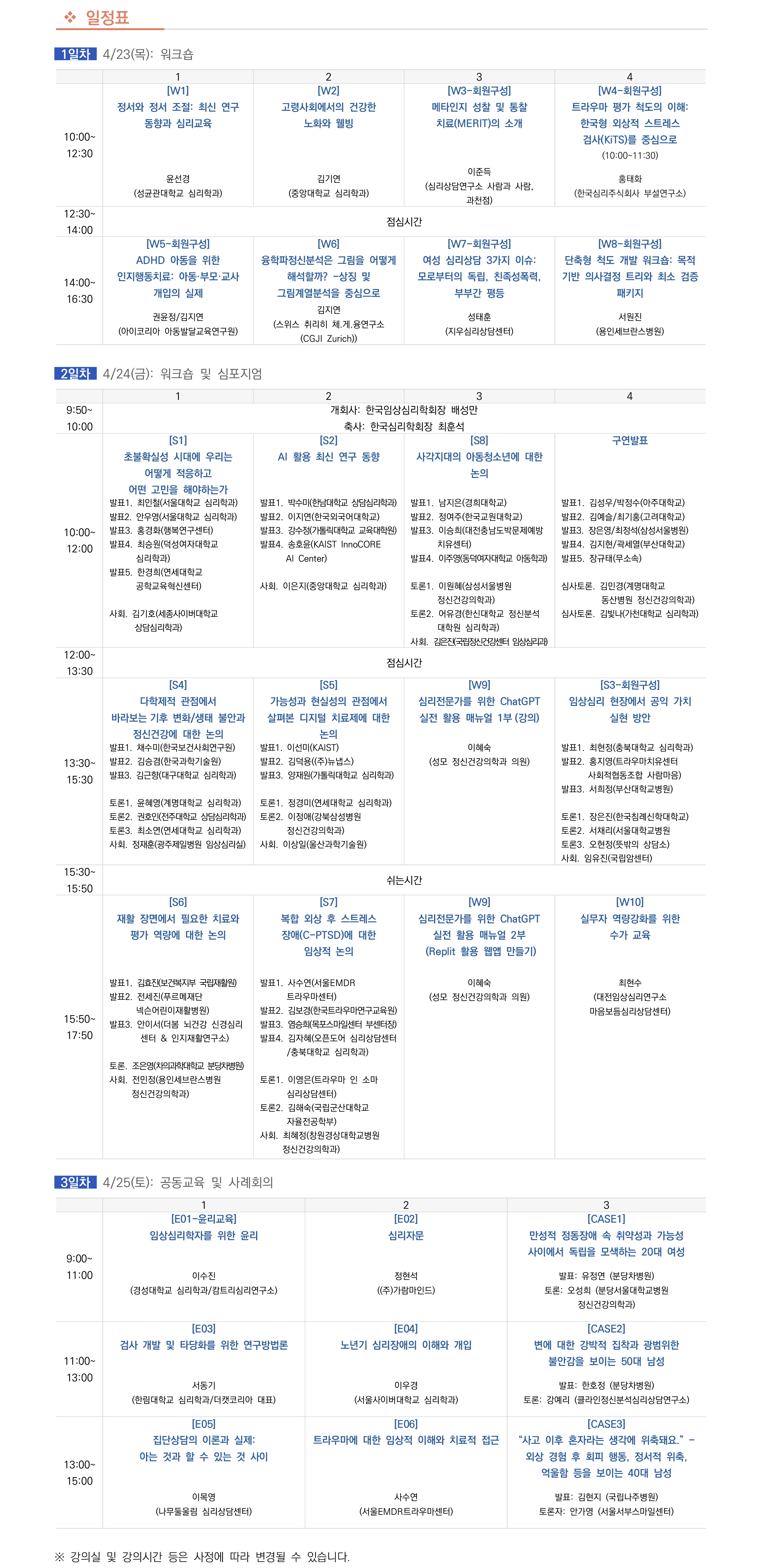 · 3일차 사례회의발표: 온라인 사례회의 지침에 따라 최대 95명까지 신청할 수 있으며, 선착순으로 접수를 진행합니다. (증원 불가, 증원계획 없음) 내담자 개인정보 보호와 관련한 윤리규정이 강화됨에 따라 사례회의 참관가능자를 <한국임상심리학회 회원>으로 제한됩니다. 비회원(게스트/승인대기자)은 사전등록 기간 중 사례회의 참관을 신청하는 경우 동시간 대 다른 강의로 변경될 예정이오니 이 점 양해 부탁드립니다.