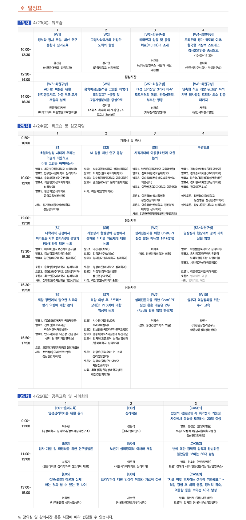 · 3일차 사례회의발표: 온라인 사례회의 지침에 따라 최대 95명까지 신청할 수 있으며, 선착순으로 접수를 진행합니다. (증원 불가, 증원계획 없음) 내담자 개인정보 보호와 관련한 윤리규정이 강화됨에 따라 사례회의 참관가능자를 <한국임상심리학회 회원>으로 제한됩니다. 비회원(게스트/승인대기자)은 사전등록 기간 중 사례회의 참관을 신청하는 경우 동시간 대 다른 강의로 변경될 예정이오니 이 점 양해 부탁드립니다.